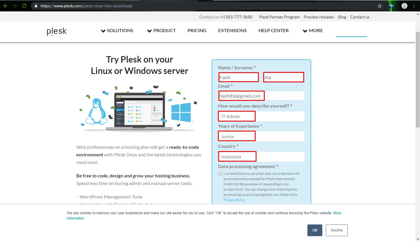 Pengujian Selanjutnya DIsini kita coba menggunakan plesk, pastikan juga sudah menonaktifkan atau menguninstall si zpanel agar tidak bentrok dengan plesk nantinya, pertama sekali buka situs plesk pada web browser anda dengan mengetikkan https://www.plesk.com/ lalu pilih tab TRY FOR FREE, disini kita mencoba instal plesk dengan versi trial. Batas waktu yang digunakan sekitar 15 hari (versi trial). Kalau versi berbayarnya silakan cek disitusnya tersebut. Kemudian kita masukkan gmail kita yang aktif dan isikan identitas tertentu agar bisa download plesk ini